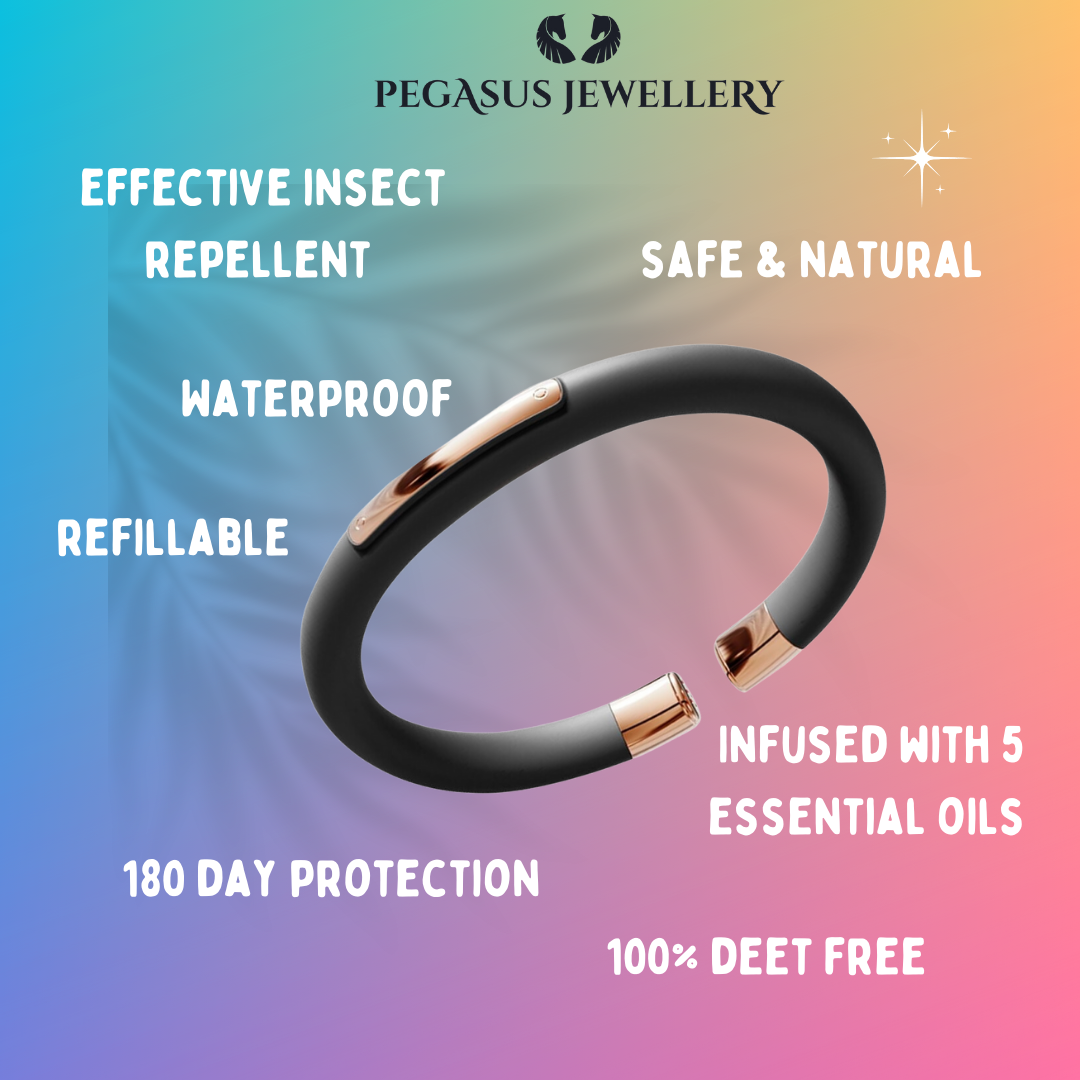 Stay bug-free in style with our Insect Repellent Bracelet. Crafted with a chic silicon design and accented with elegant rose gold touches, this bracelet seamlessly combines fashion and function. It features five essential oil stick inserts that easily screw into rose gold caps, providing a refillable and natural way to repel insects.