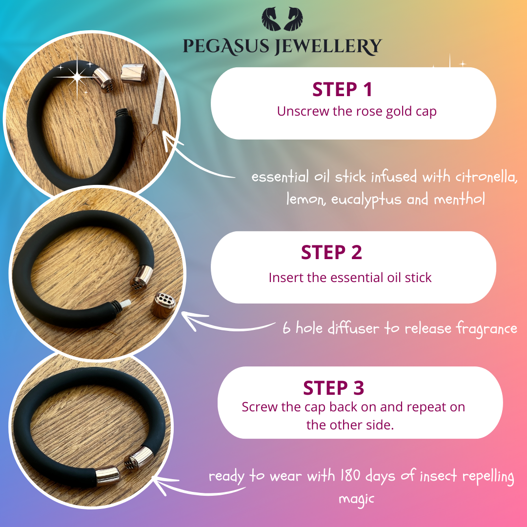 Follow the video above, unscrew the rose gold caps and and place the insect repellent sticks in the gap and twist the cap back on.